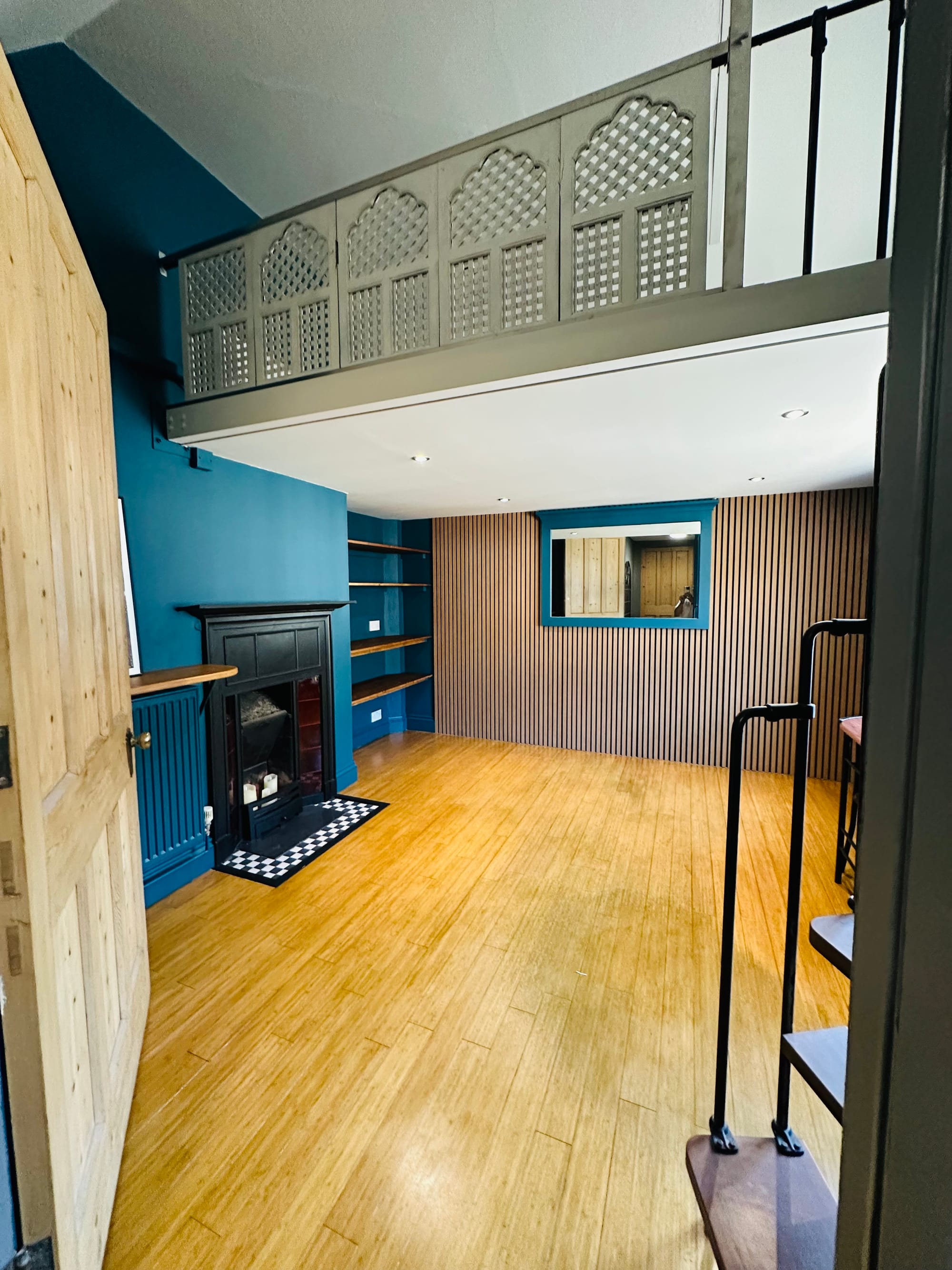 Understanding the need for extra sleeping quarters, we converted the existing loft void into a snug mezzanine bedroom. A custom spiral staircase, finished in black metal with wooden treads, provides access without sacrificing precious floor area. Up top, the loft offers room for a double mattress, reading light, and railing screening that echoes the nearby fireplace’s arched pattern—turning an under-used attic into a premium sleeping nook.