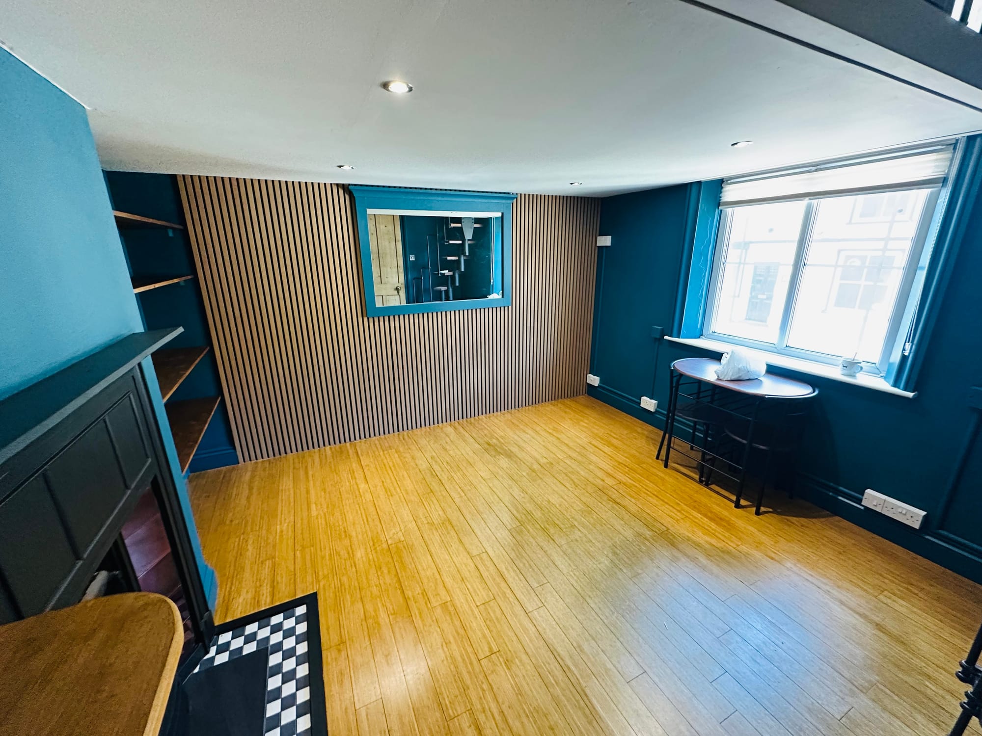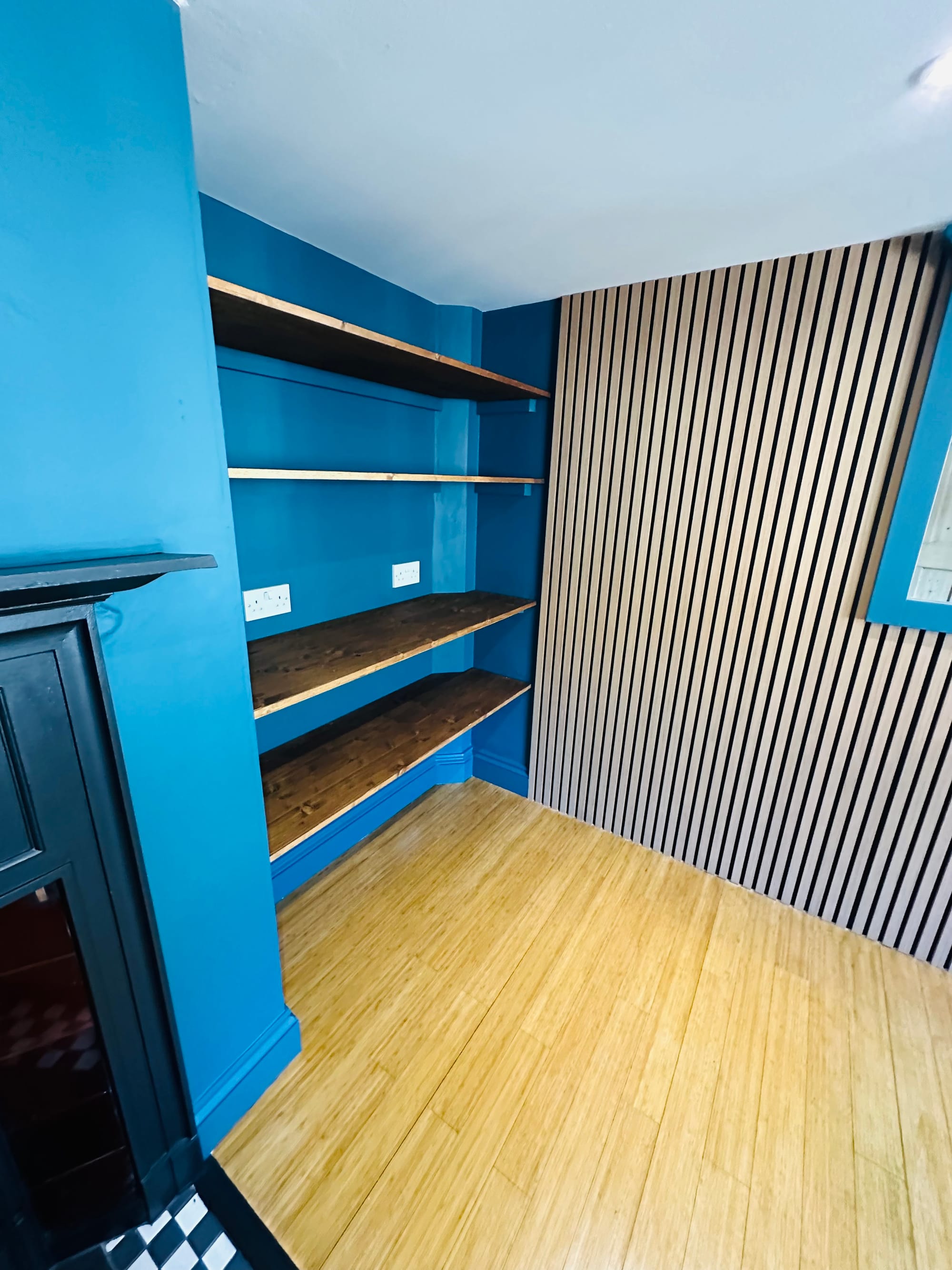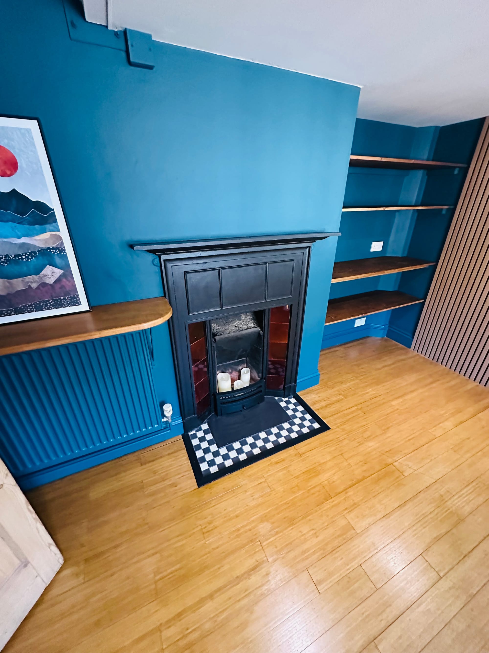 Space is at a premium in a small annexe, so we designed and fitted custom floating shelves around the fireplace alcove. Crafted from sustainably sourced timber and stained to complement the deep teal walls, these shelves provide ample display and storage space for the fridge and microwave without encroaching on the room’s footprint. Guests can neatly organise books, board games, or decorative touches on the higher shelves keeping the lounge clutter-free.
