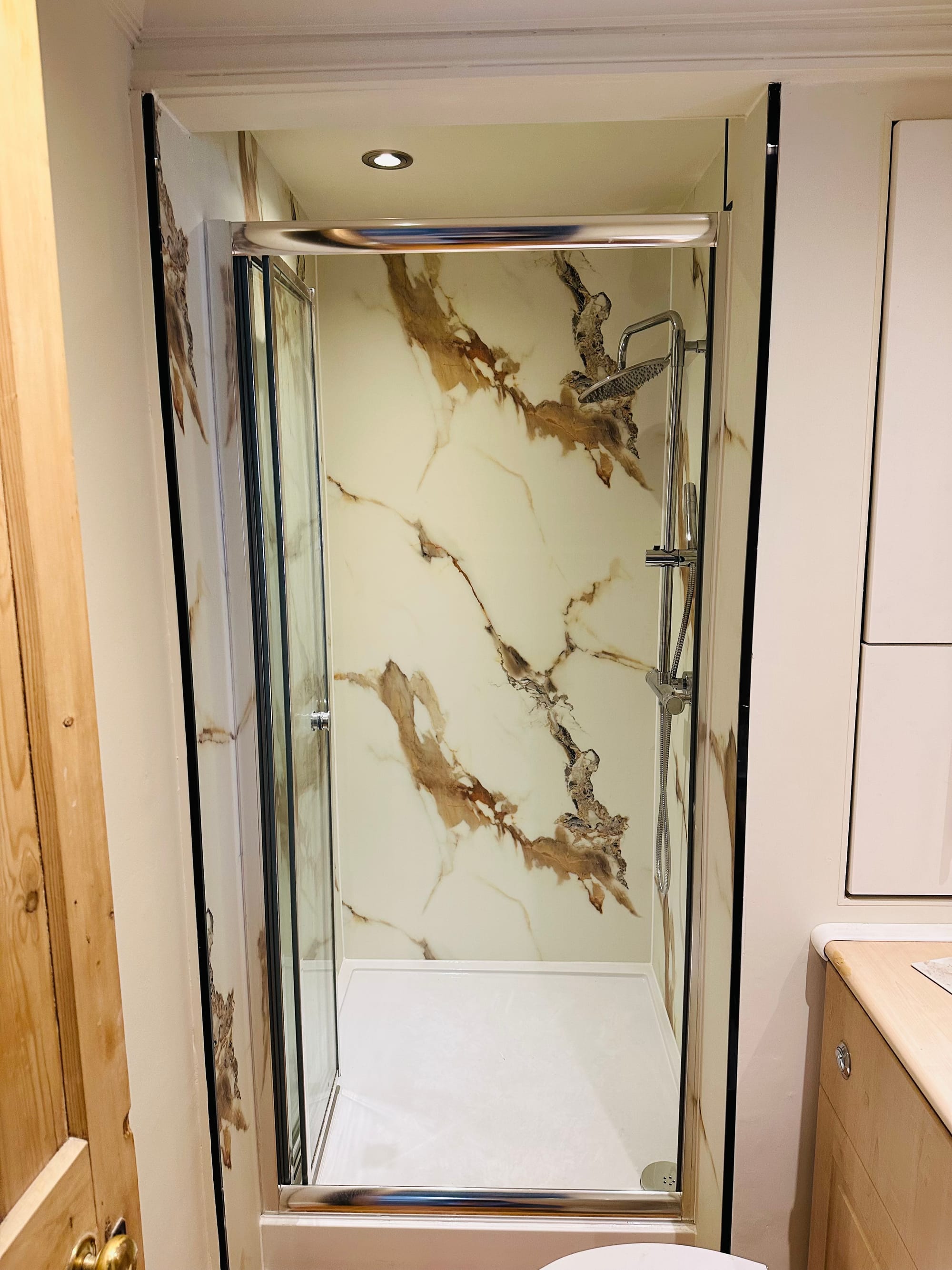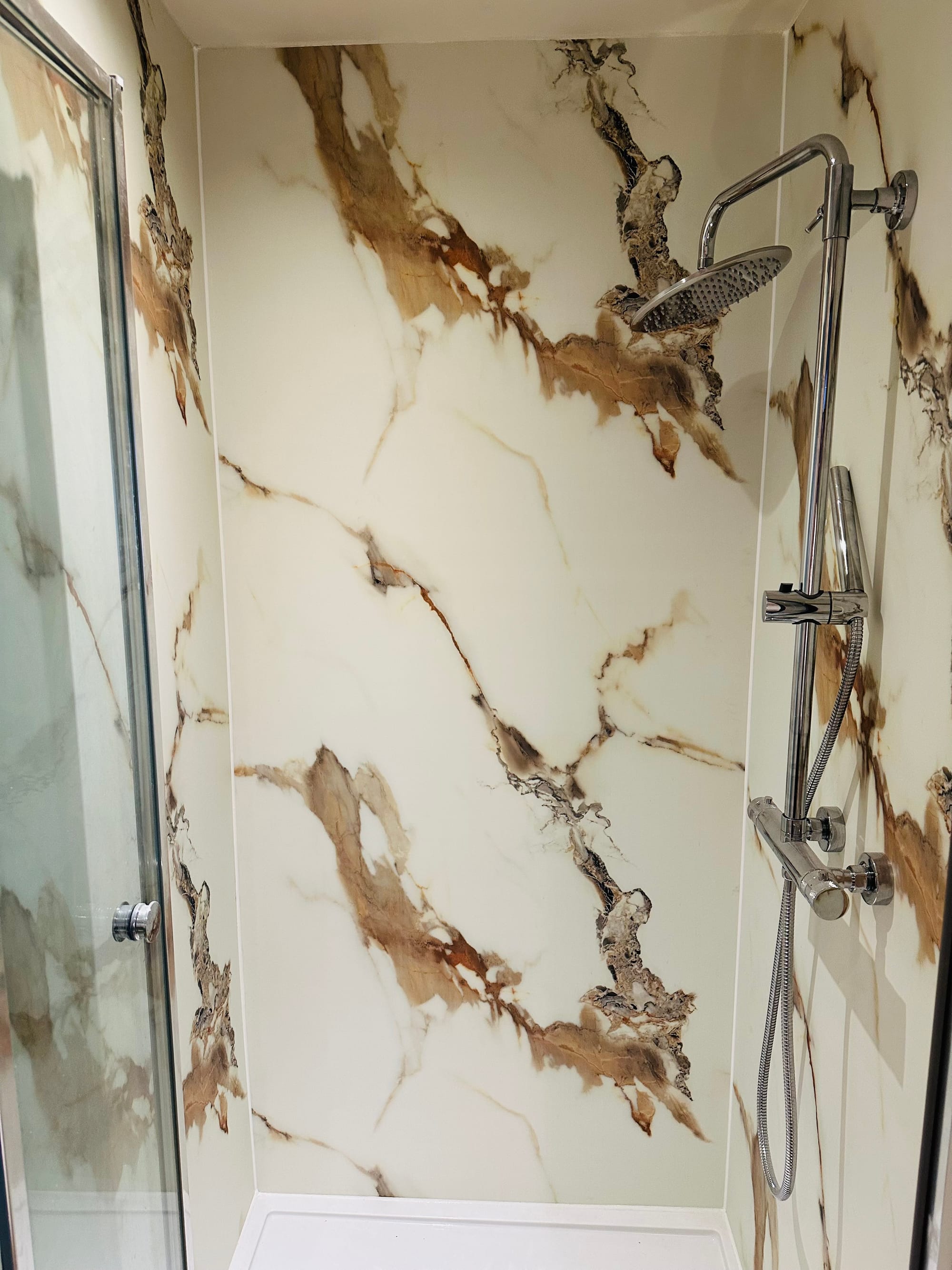 The annexe’s new bathroom is contemporary and practical. We installed a walk-in shower tray, then lined the walls with premium, waterproof shower panels. These panels not only provide a seamless, grout-free finish but are also brilliantly easy to clean—ideal for a busy holiday let. A rainfall showerhead and polished chrome fittings complete the spa-like feel, offering guests a truly revitalising experience each morning.