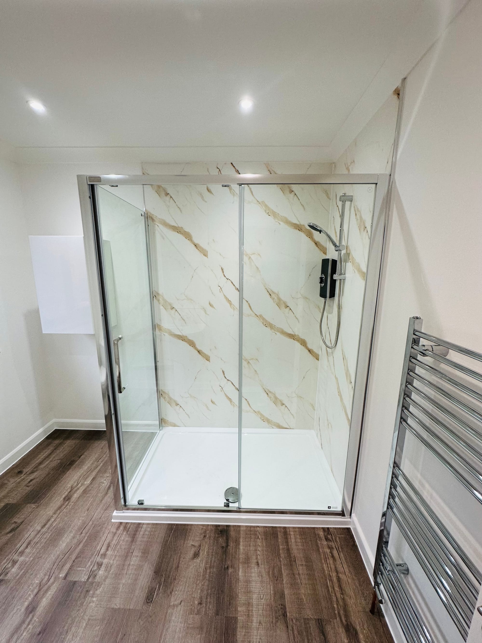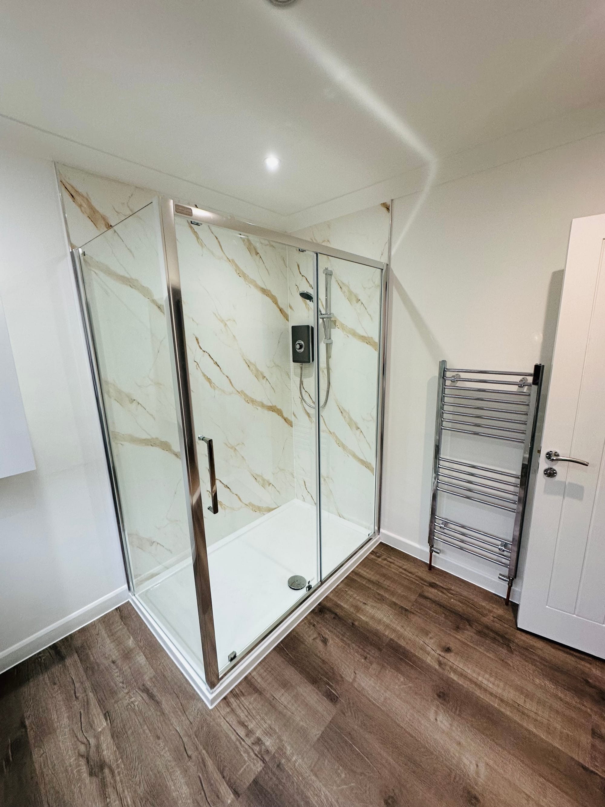 The project began with the essential groundwork. We installed all the required water feeds and waste runs, carefully integrating them into the existing structure to ensure long-term reliability and compliance. With the services in place, the room was ready to be fully reimagined as a modern shower space.