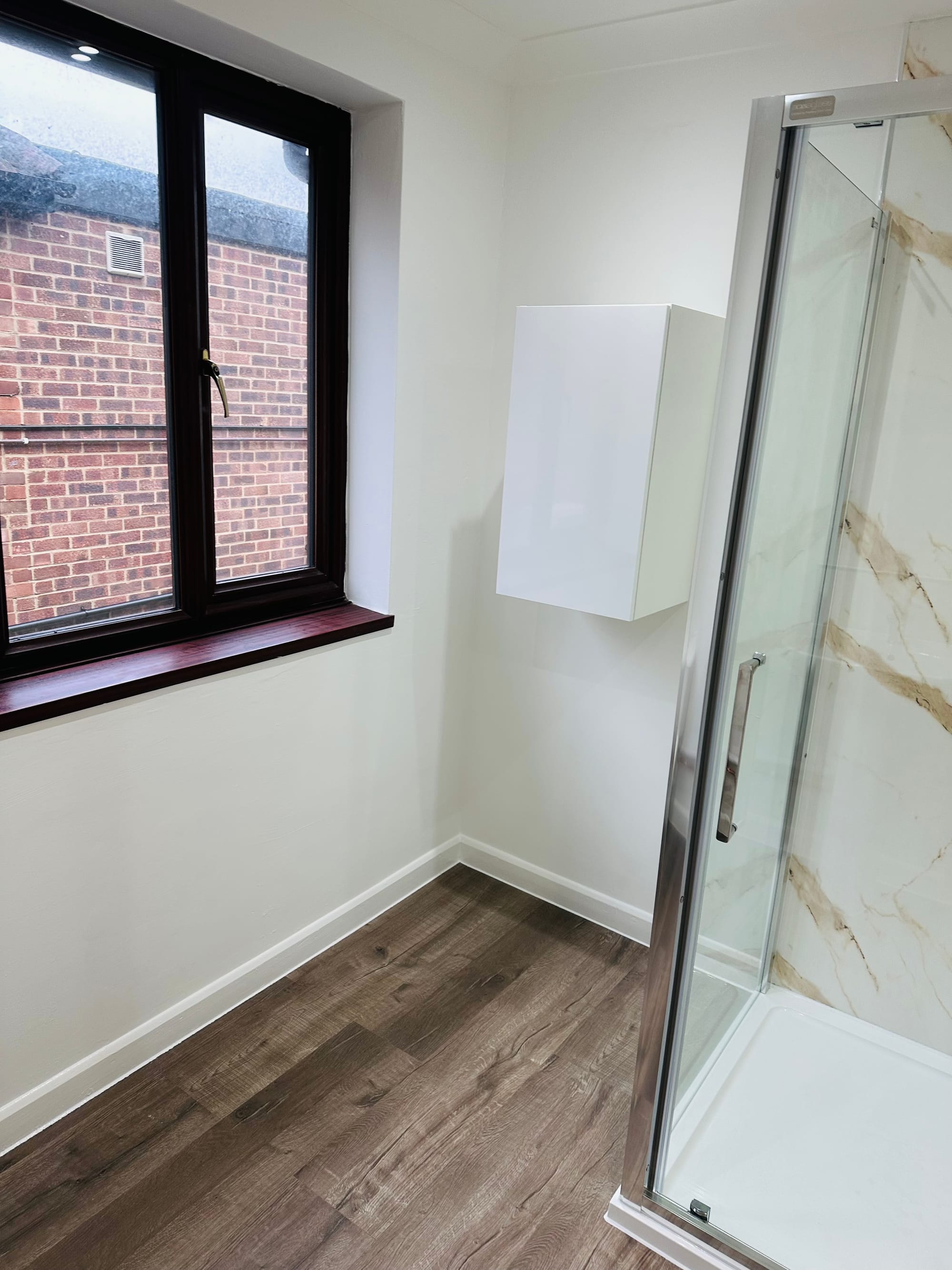 The floor was finished with Mercia Brown LVT plank flooring, chosen for its durability, water resistance, and warm, natural appearance — a practical yet stylish solution for a shower room environment.