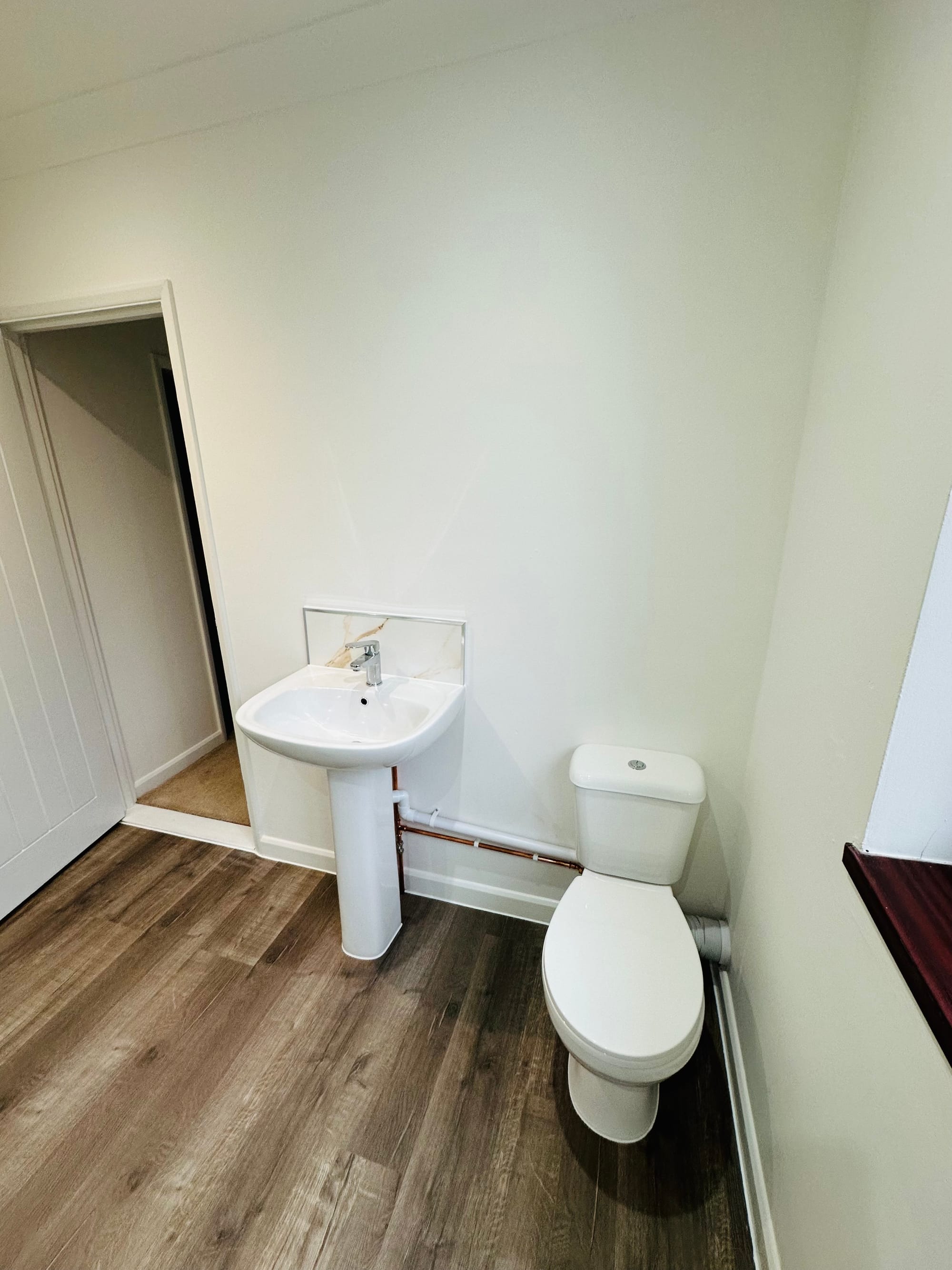 We installed a new basin and toilet, keeping the layout simple and functional, while a shower panel splashback was fitted to provide easy maintenance and a sleek, modern look.