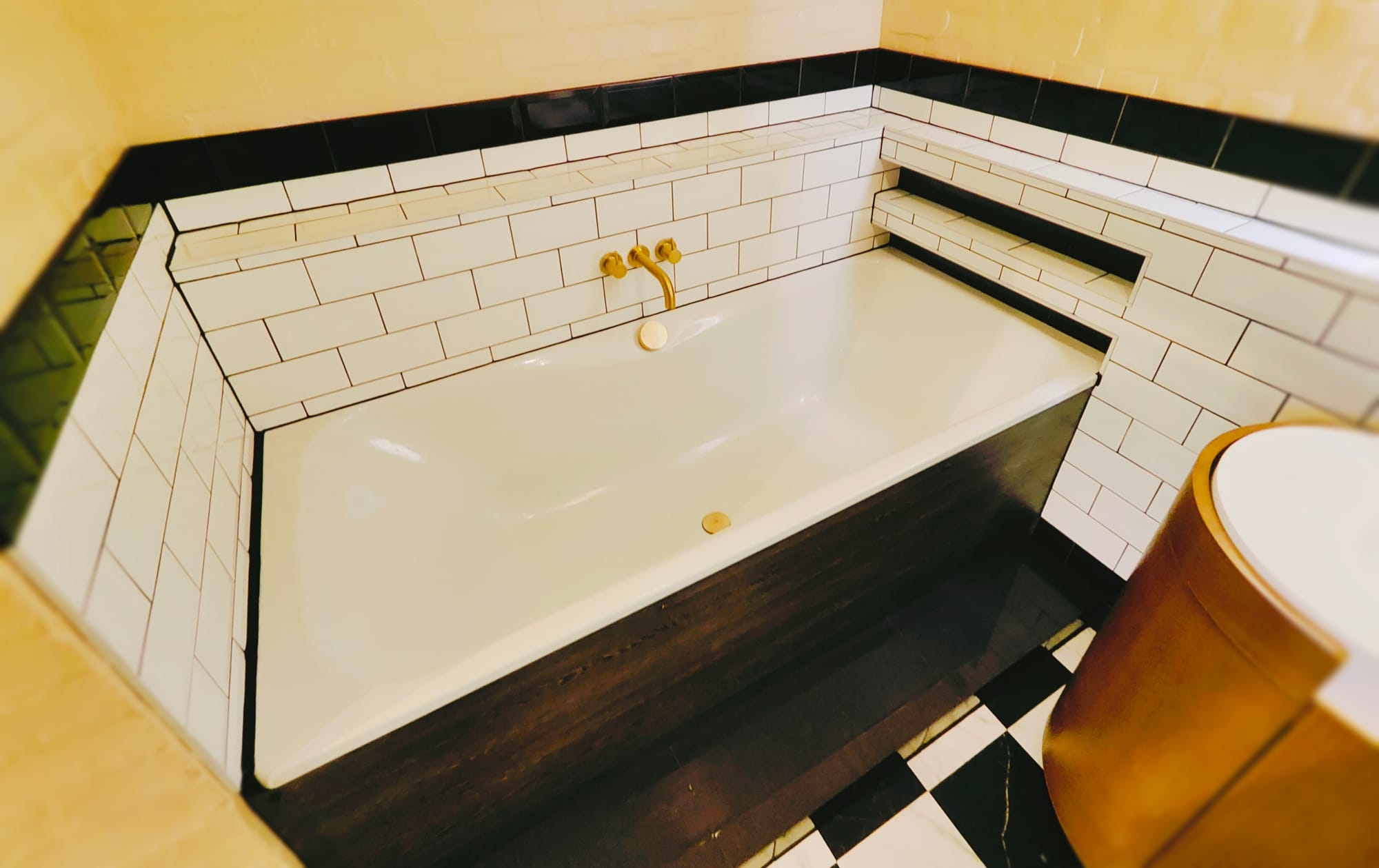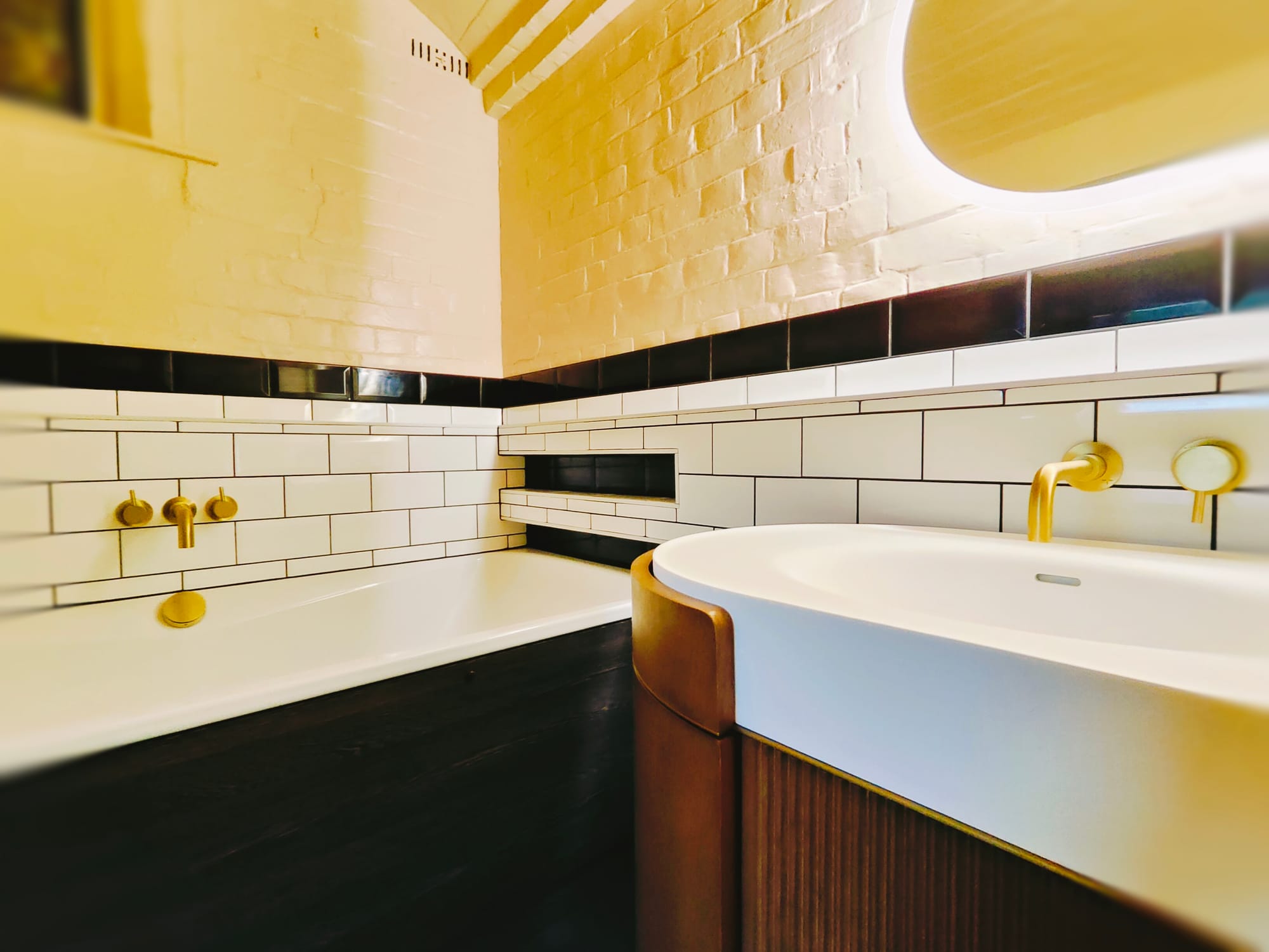 The finishing touch was the use of brick bond Metro tiles in a striking black and white pattern. These tiles added texture and visual interest while tying together the traditional and modern elements of the design.