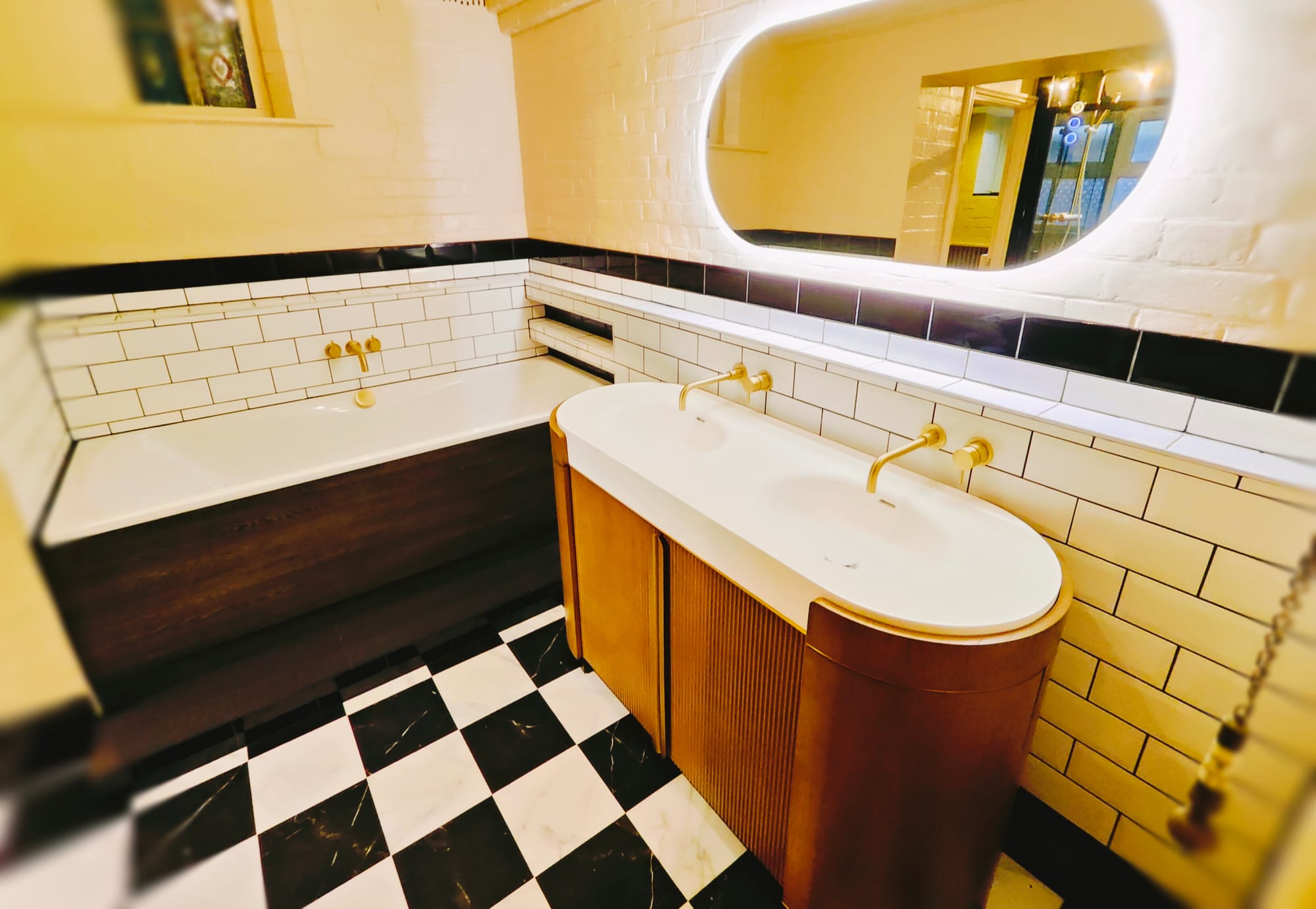 One of the standout features of the project was the stunning 1400mm double vanity unit that was custom-designed to fit the space perfectly. The independent wall-mounted taps, installed both at the bath and vanity unit, added a sleek and modern touch while maximizing the room’s flow, while the illuminated (and heated) mirror above the vanity, of the same shape make a great double act of class.