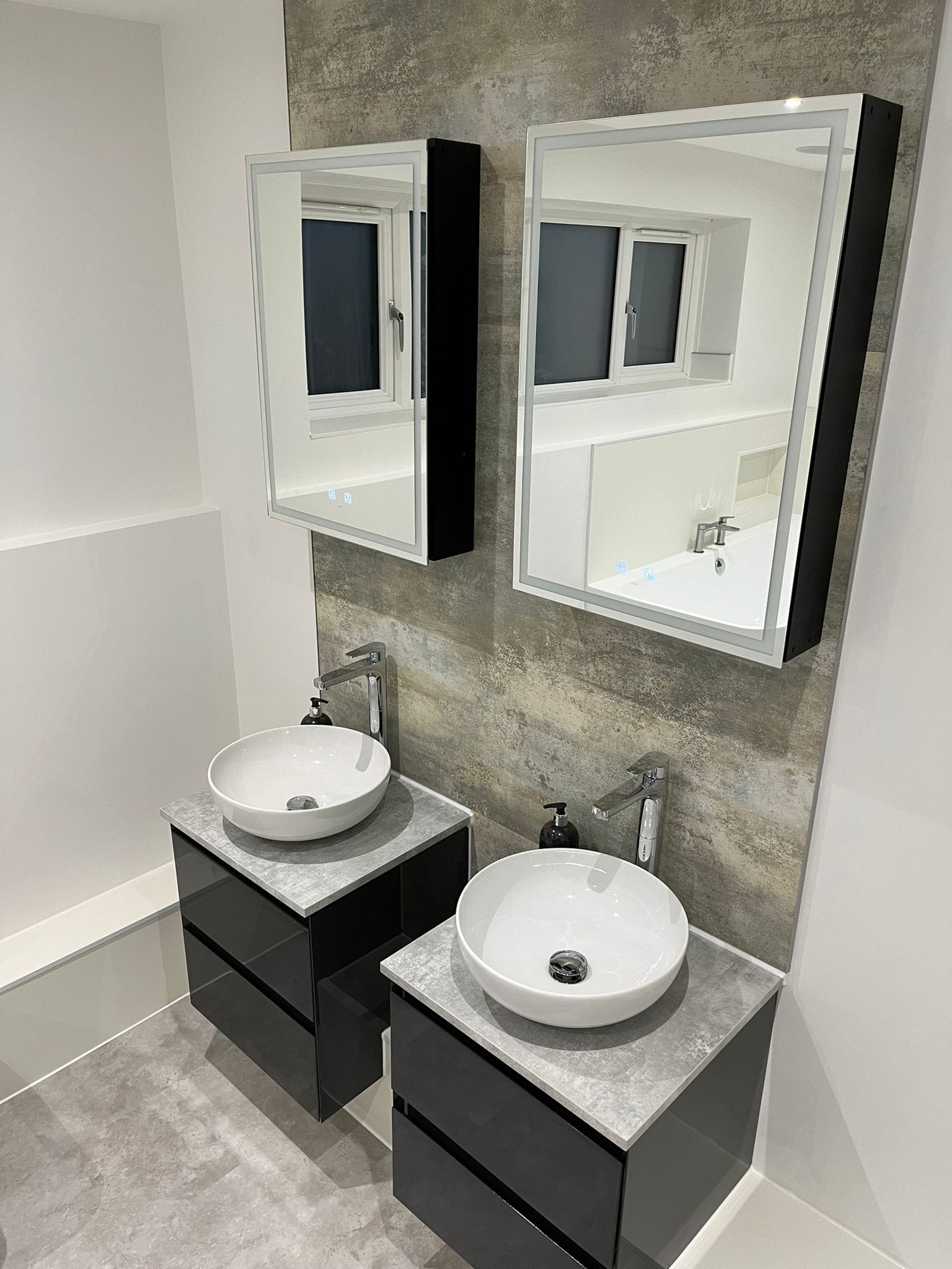 One of the standout features of this renovation is the twin vanity units. These units provide ample storage space and offer a sleek, modern design that suits the contemporary style of the room. The lighted mirrors above them add a touch of sophistication while offering excellent lighting for daily grooming tasks. The mirrors are integrated with subtle LED lights that cast a soft glow, creating a relaxing atmosphere.