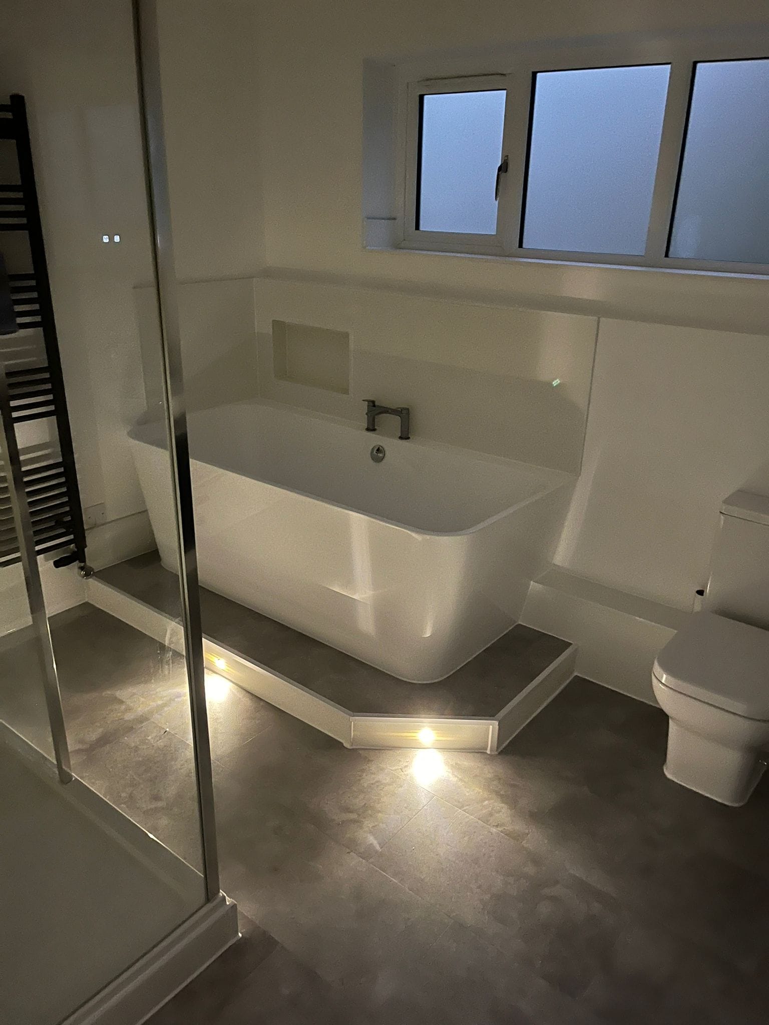 The bath tub is positioned to provide both comfort and aesthetic appeal. Raised on a lighted plinth, the bath has become a focal point of the room, adding an element of elegance and contemporary style. The lighting under the plinth creates a soft ambiance that enhances the overall mood of the bathroom.