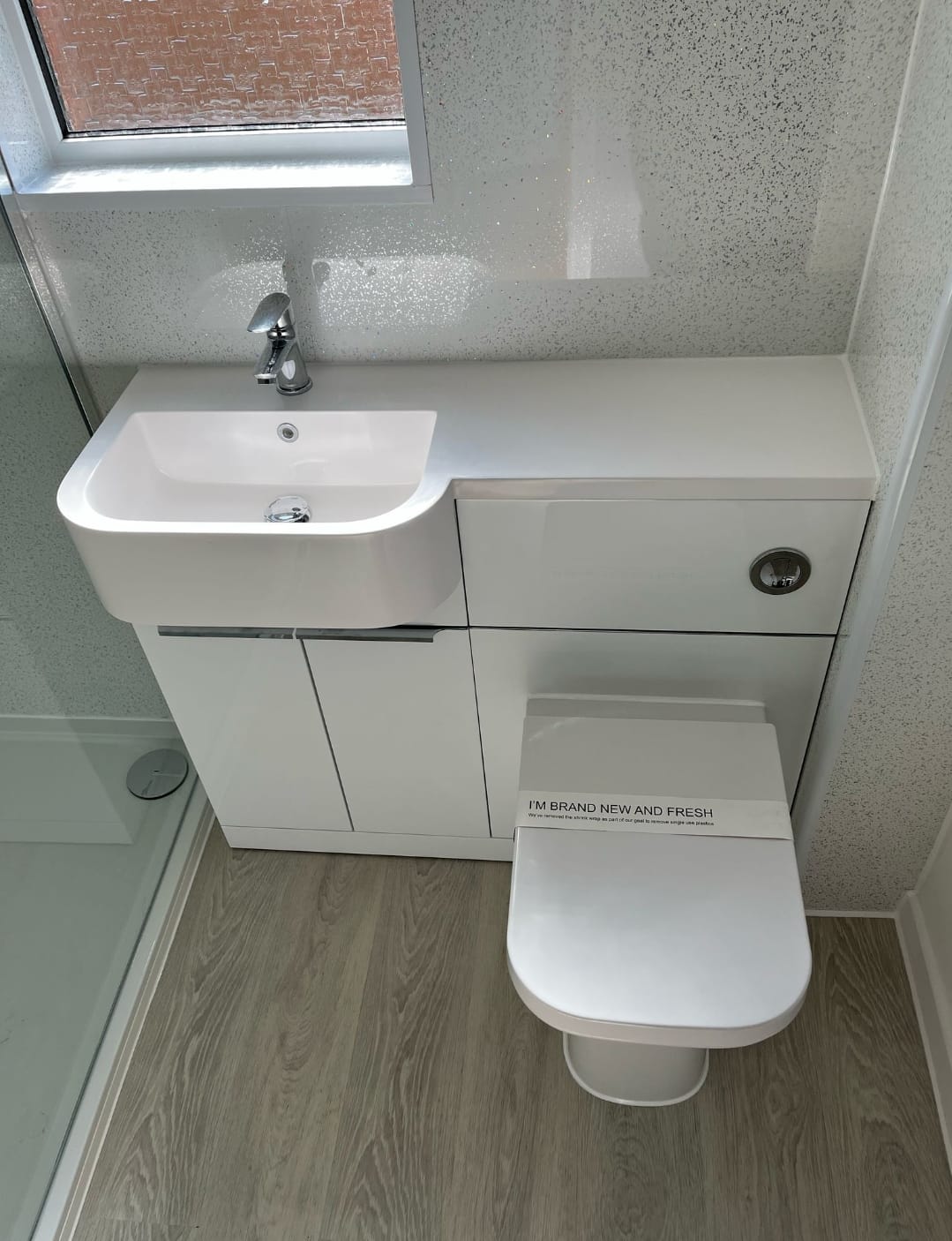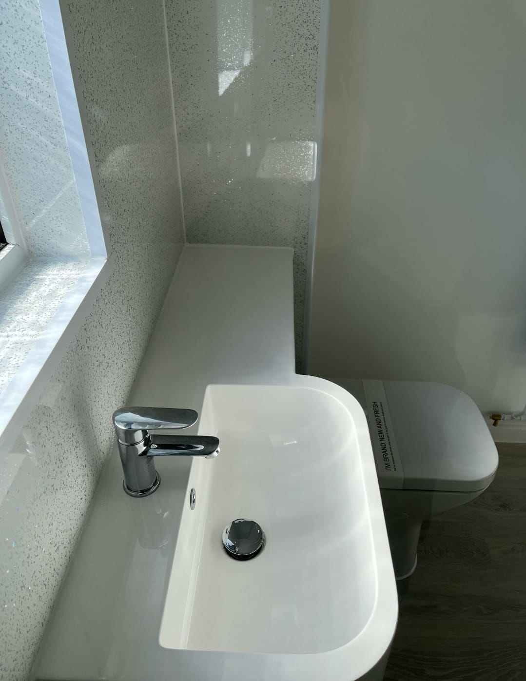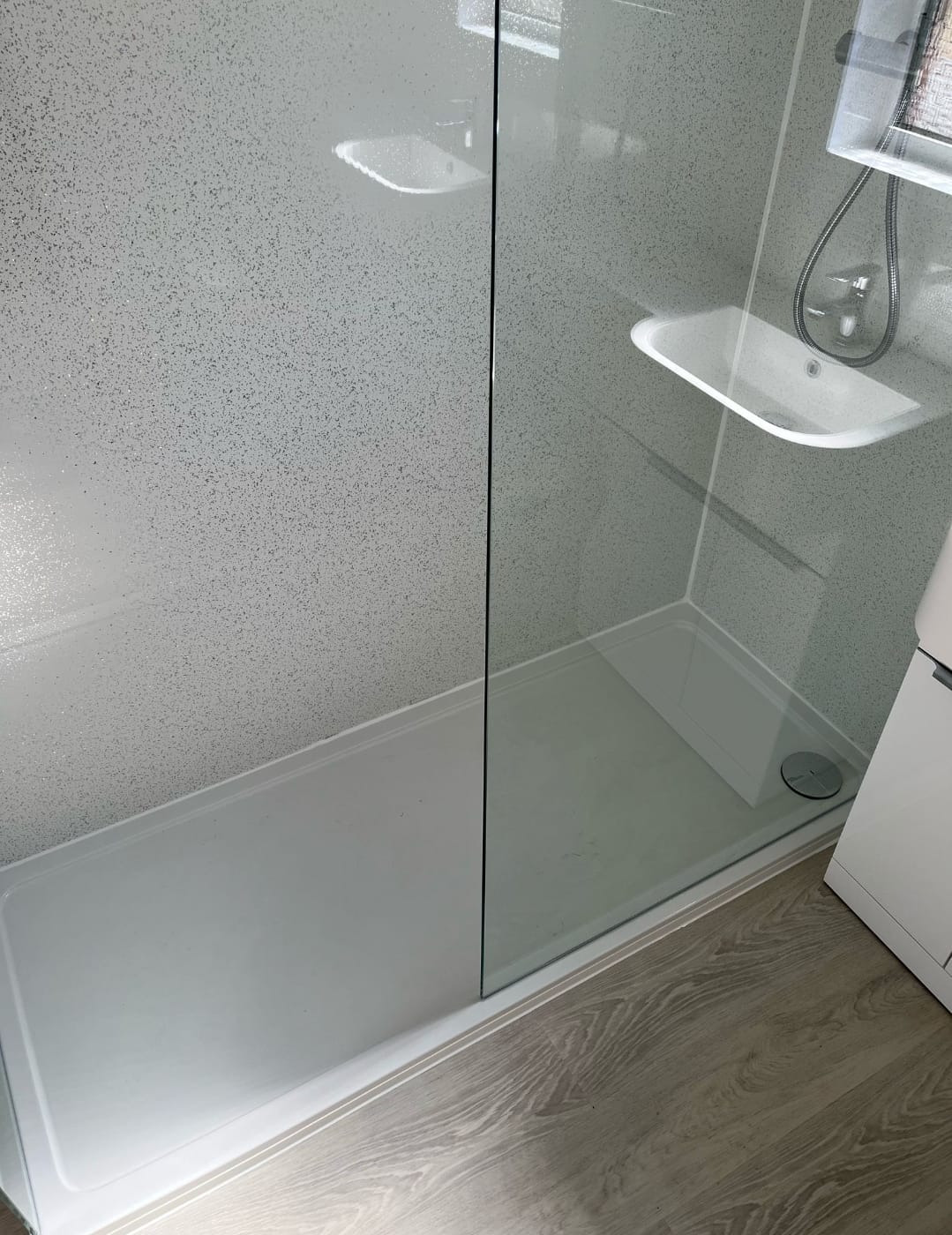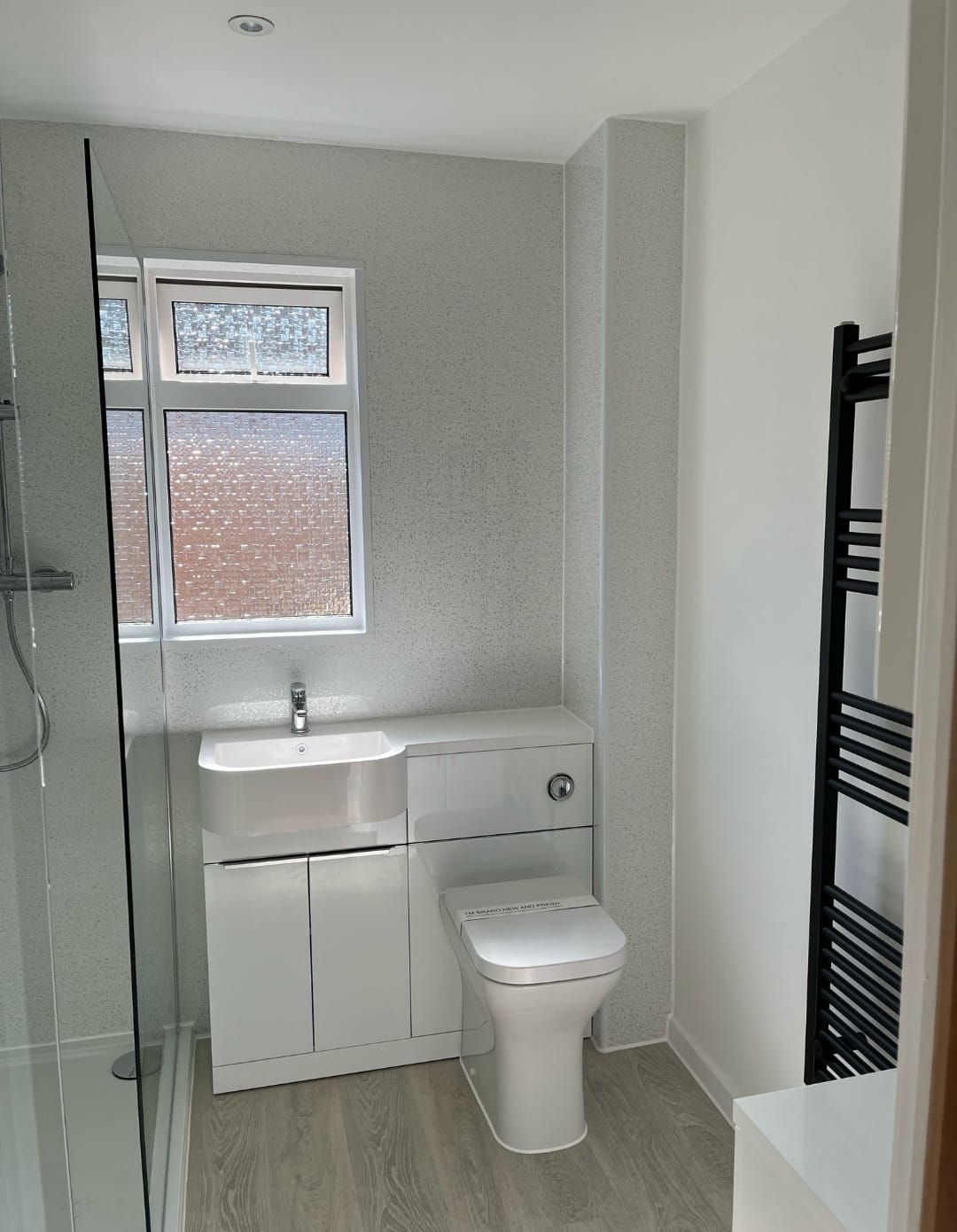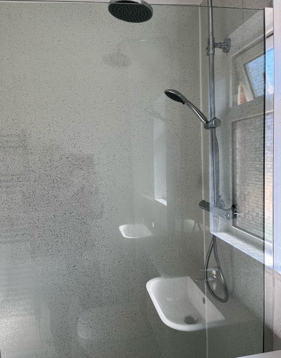 The centrepiece of this bathroom makeover is a 1700mm doorless glazed shower enclosure, offering an open and airy feel. Fitted with a drencher head shower, it provides a spa-like experience, ensuring a relaxing and invigorating start to the day. The frameless glass enhances the contemporary aesthetic while keeping the space light and open with White Sparkle Shower Wall offering a highly classy finish with low maintenance for the customer.