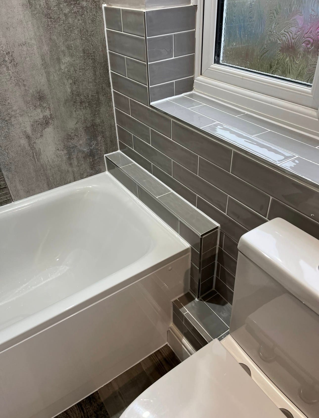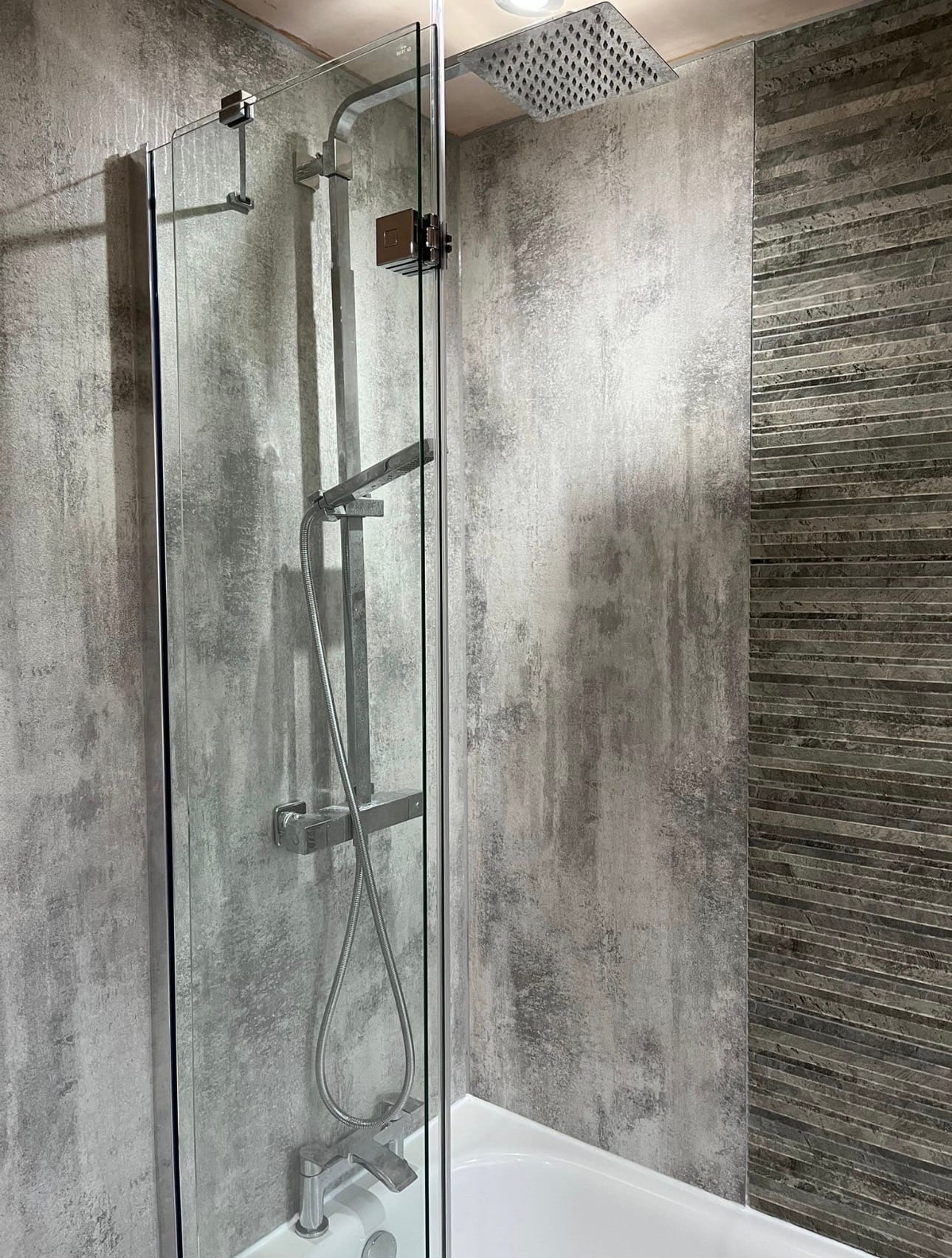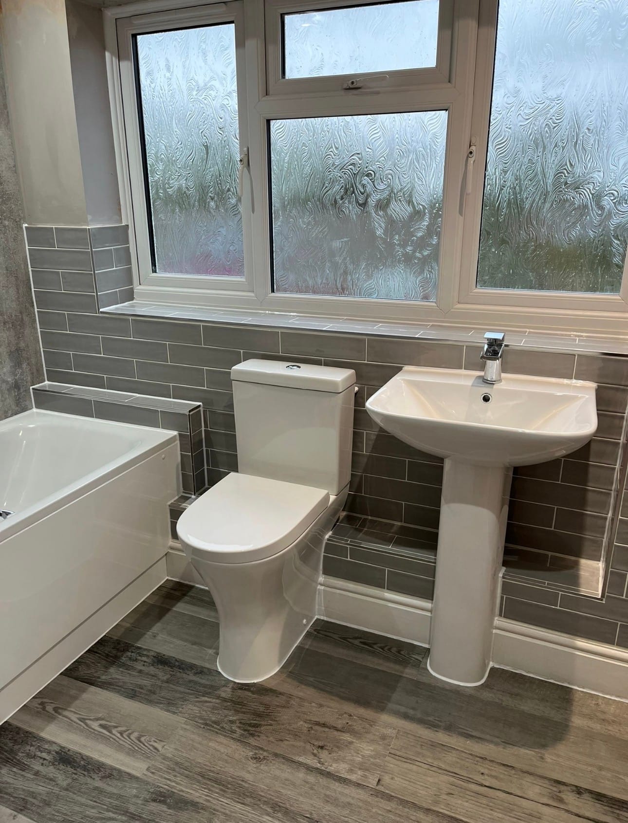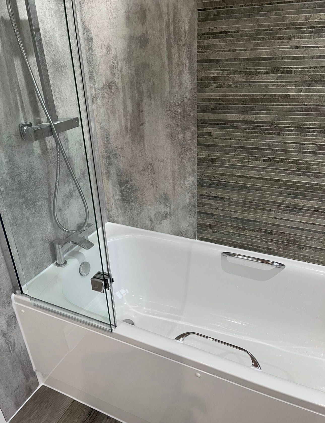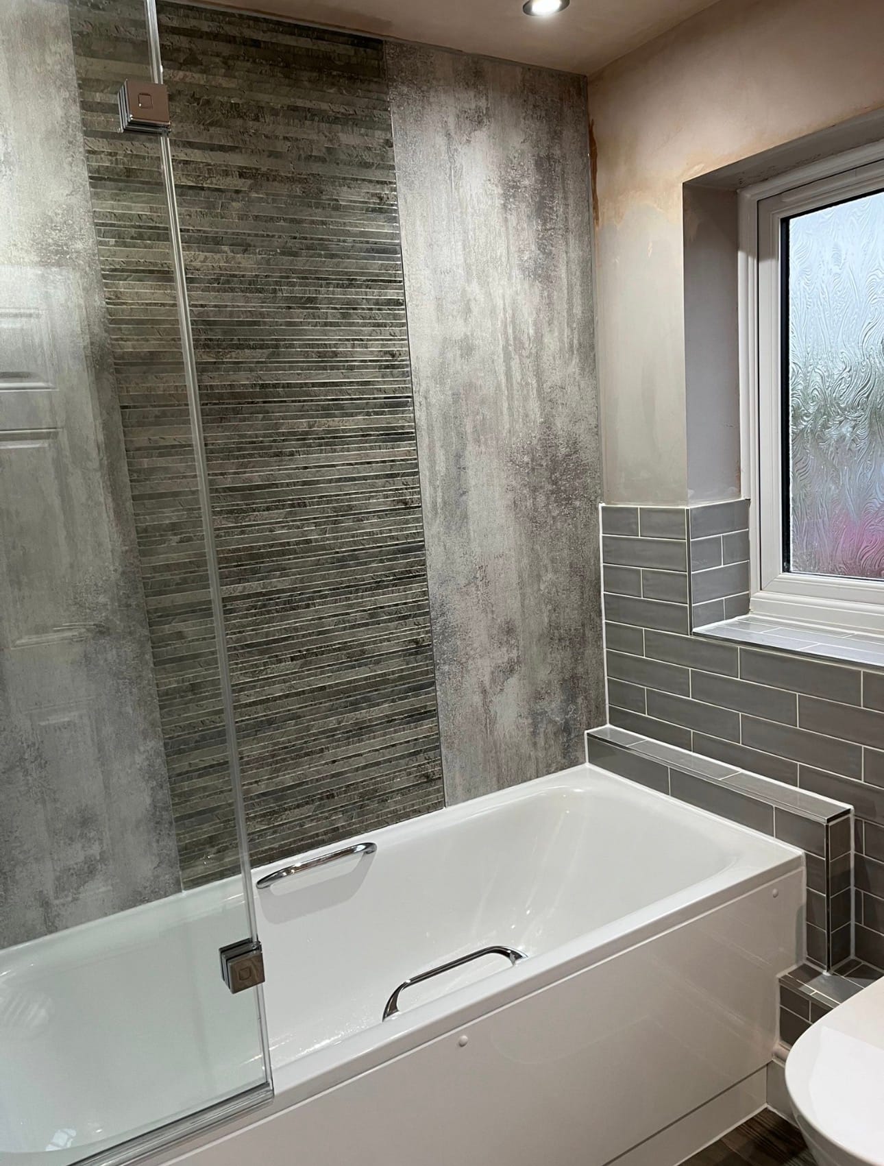 This project was a complete overhaul. The old bathroom was fully removed so we could re-plumb the space and install a brand-new suite. We fitted a sleek new bath with a matching bath screen, along with contemporary shower wall panels that give the room a clean and seamless finish.